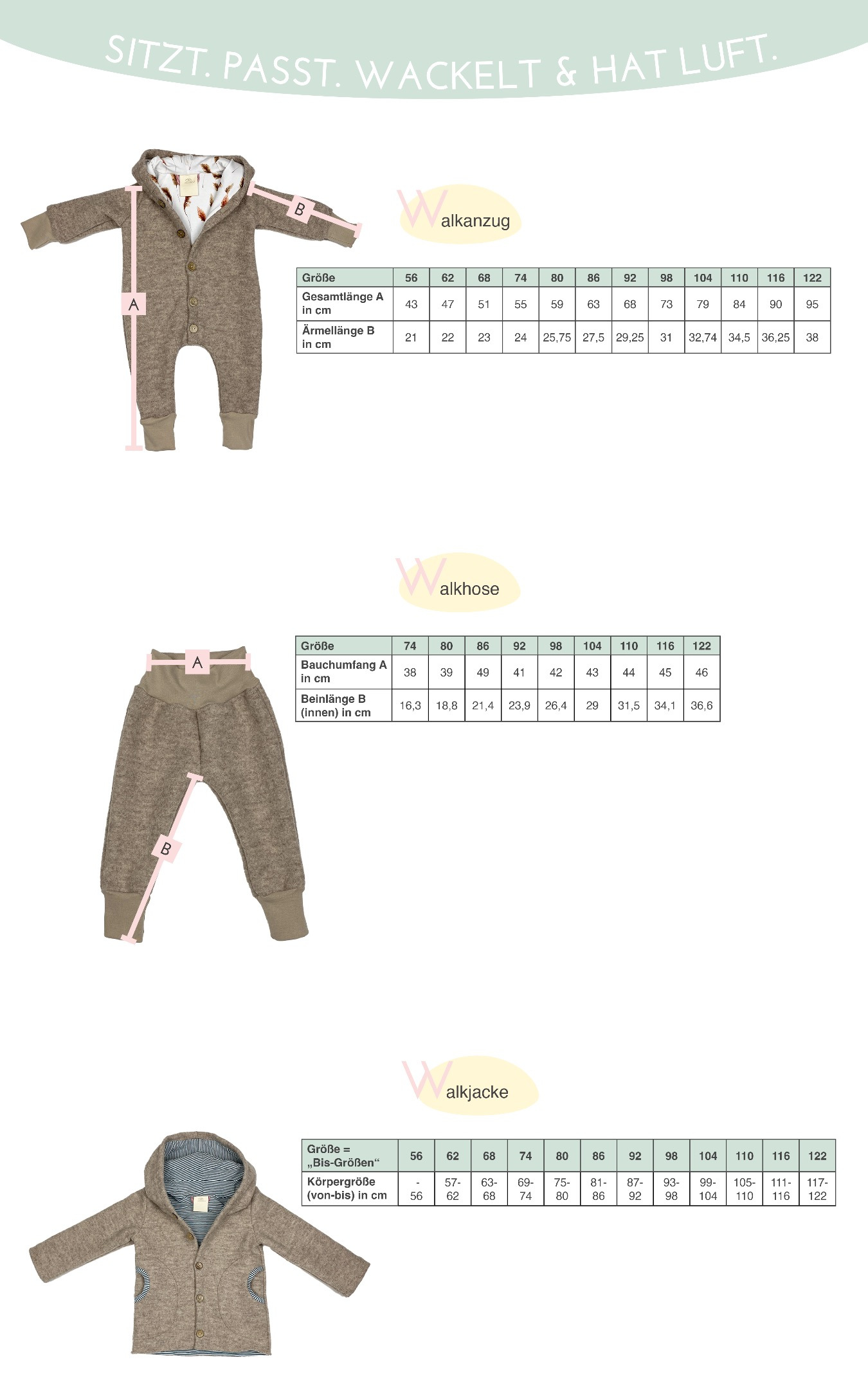 Für unsere Walkjacken verwenden wir als Schnittmuster eine Abwandlung der Lyblingsjacke von Lybstes. Der Schnitt fällt normal aus und hat ausreichend Platz für Shirt und Pullover darunter. Unsere Walkjacken sind in den Größen 56 bis 122 erhältlich. Die Größen entsprechen der Körpergröße. Wenn dein Wirbelwind z. B. 87 cm groß ist, dann wähle die Größe 92. Denn bei den Größen handelt es sich um sogenannte "Bis-Größen".